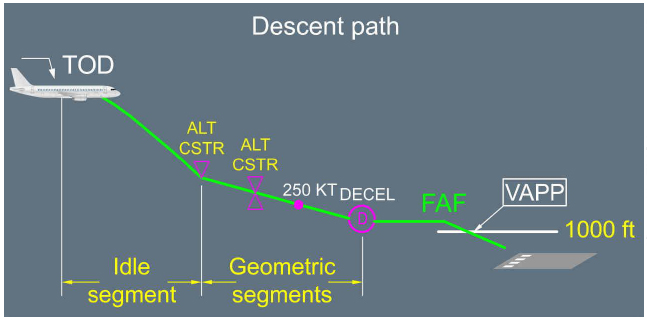 FMGS menghitung Top Of Descent (TOD) secara mundur dari posisi 1.000 ft pada final approach dengan kecepatan VAPP.