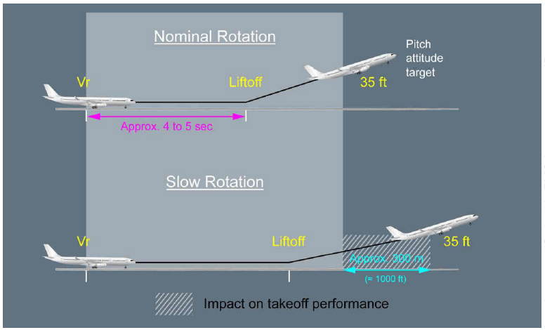 Laju rotation yang terlalu lambat atau under-rotation (di bawah target pitch takeoff) akan berdampak pada kinerja takeoff, yaitu: