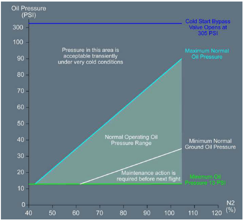Catatan: Nilai pasti biasanya ditampilkan di ECAM Engine Page selama operasi mesin. Pilot harus memastikan tekanan minyak berada di antara batas minimum dan maksimum sesuai indikasi ECAM selama semua fase penerbangan.