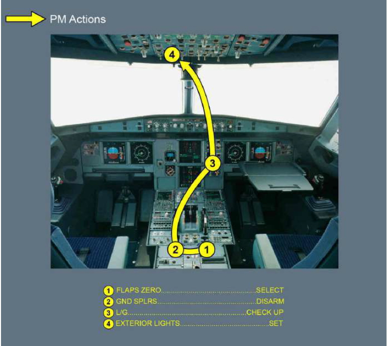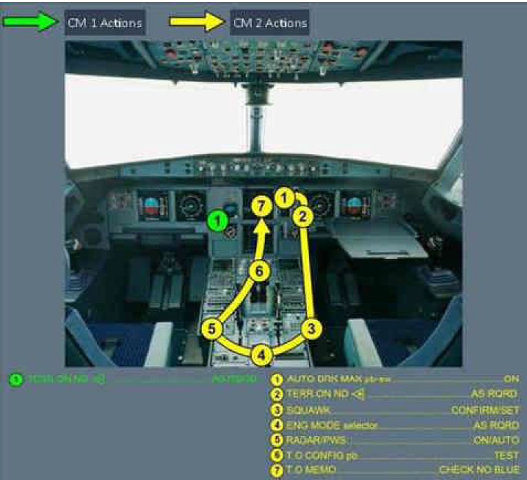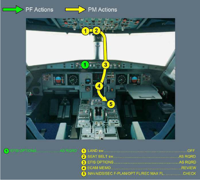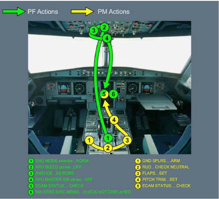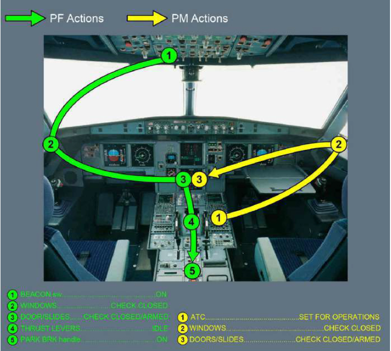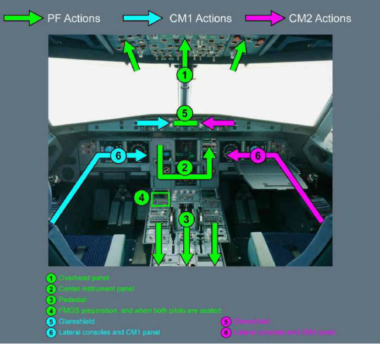 Awak pesawat melaksanakan persiapan kokpit awal untuk memastikan bahwa seluruh pemeriksaan keselamatan yang diperlukan telah selesai.