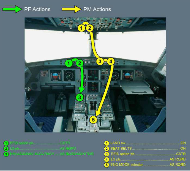 Prosedur-prosedur ini mengasumsikan bahwa semua sistem beroperasi secara normal, dan semua fungsi otomatis digunakan secara normal. Standard Operating Procedures juga mengasumsikan bahwa kedua pilot menggunakan Electronic Flight Bag (EFB). Airbus merekomendasikan pengoperasian dengan dua EFB untuk mengurangi risiko masukan yang keliru.