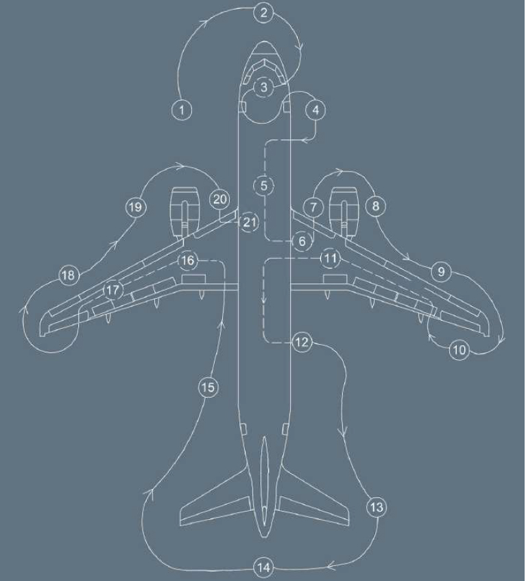 • Di darat, pada kondisi cuaca panas, dapat terdeteksi overheating di sekitar bleed ducts pada sayap, yang dapat memicu peringatan AIR L(R) WING LEAK.